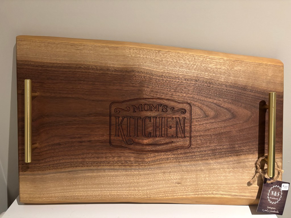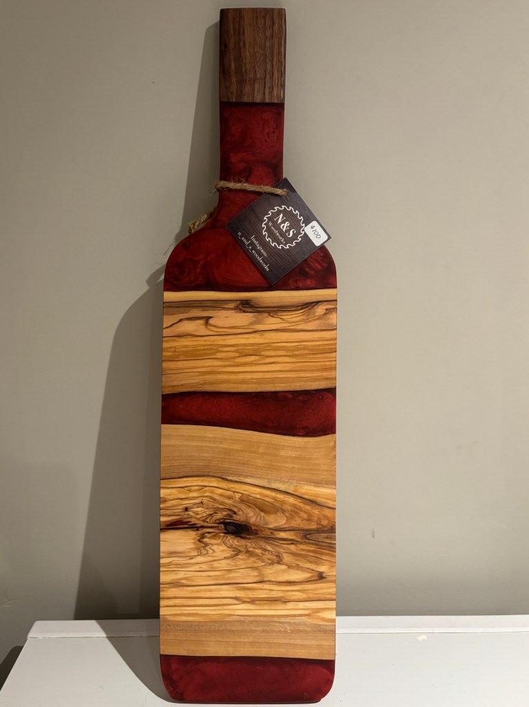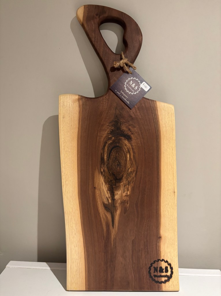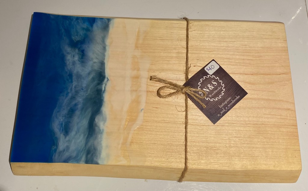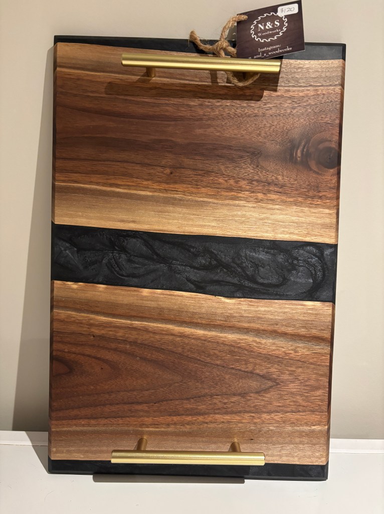 All of our charcuterie boards, trays, coasters and luxury boards are handmade with a variety of kiln dried locally sourced salvaged wood and with or without epoxy. The boards vary in width as the wood is natural and comes from different widths of Black Walnut, Maple, Cherry, or Olive Trees. Edges that are cut are beveled, sanded to a buttery smooth finish and coated in food grade wax and oil. The live edges are kept to show the natural curves and beauty of the wood.