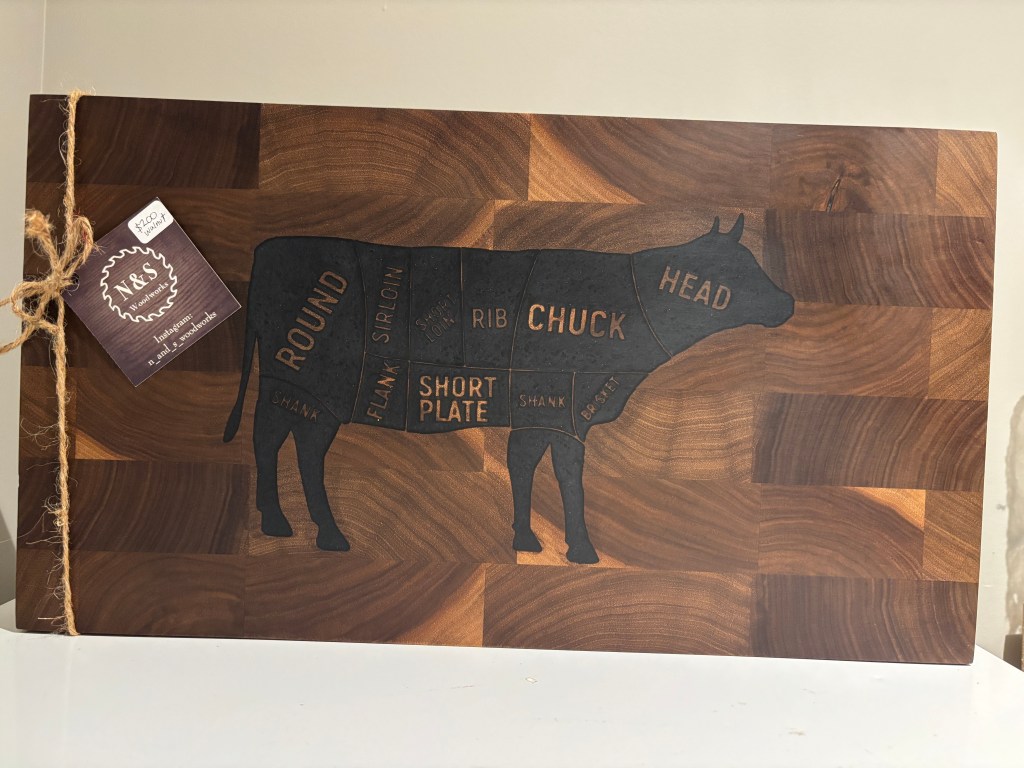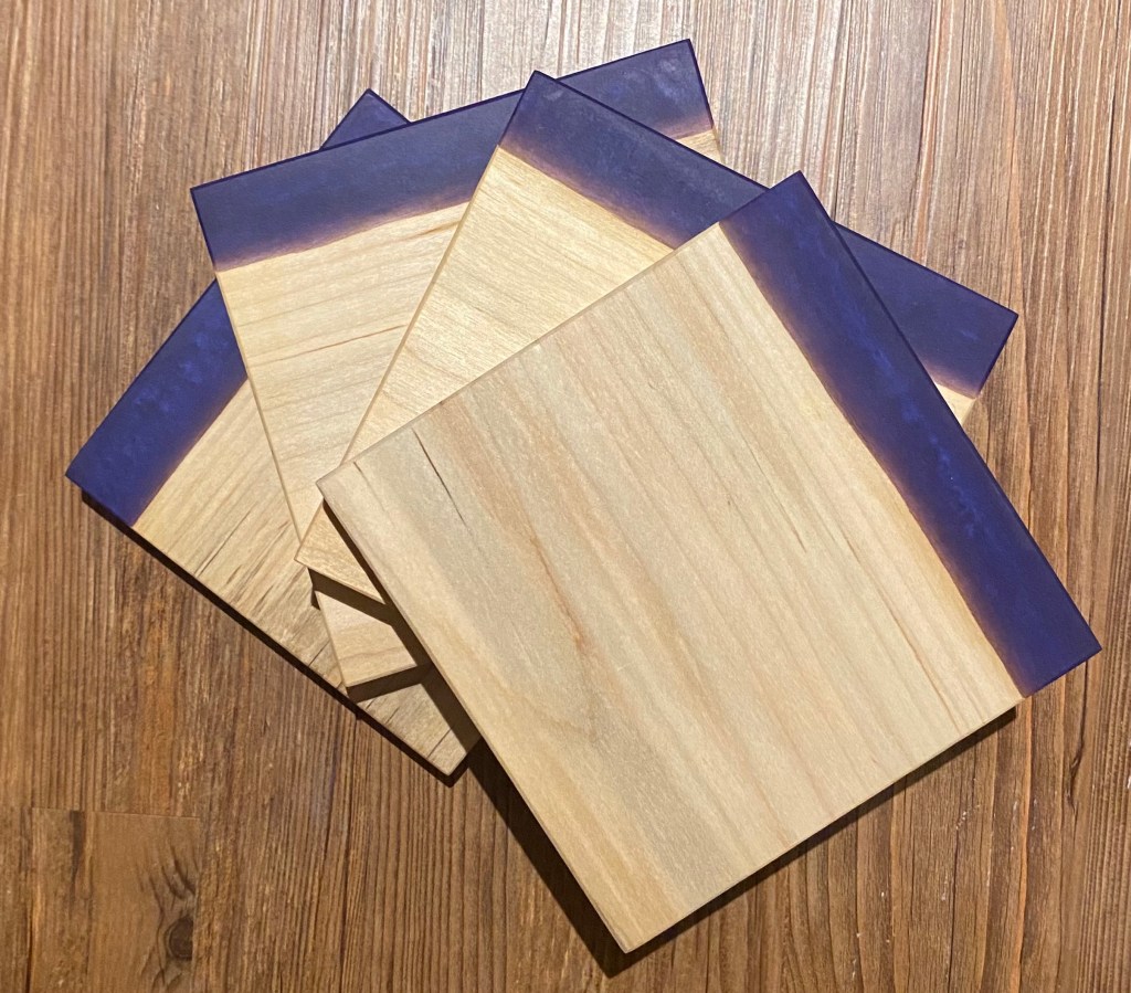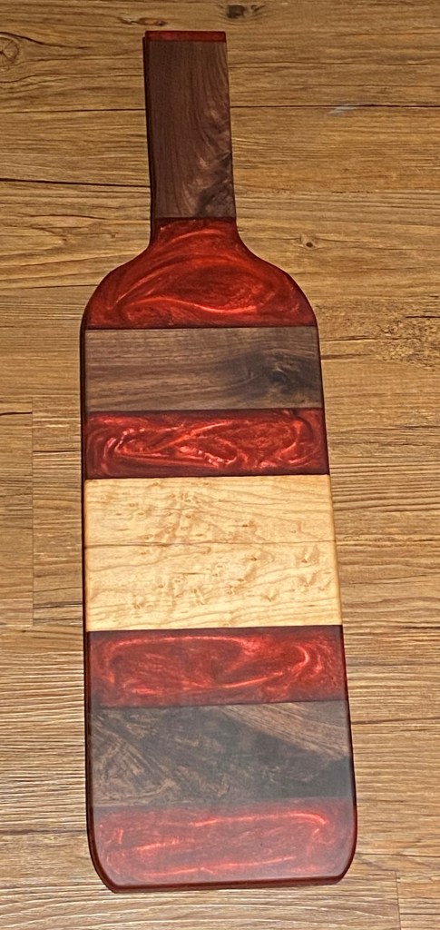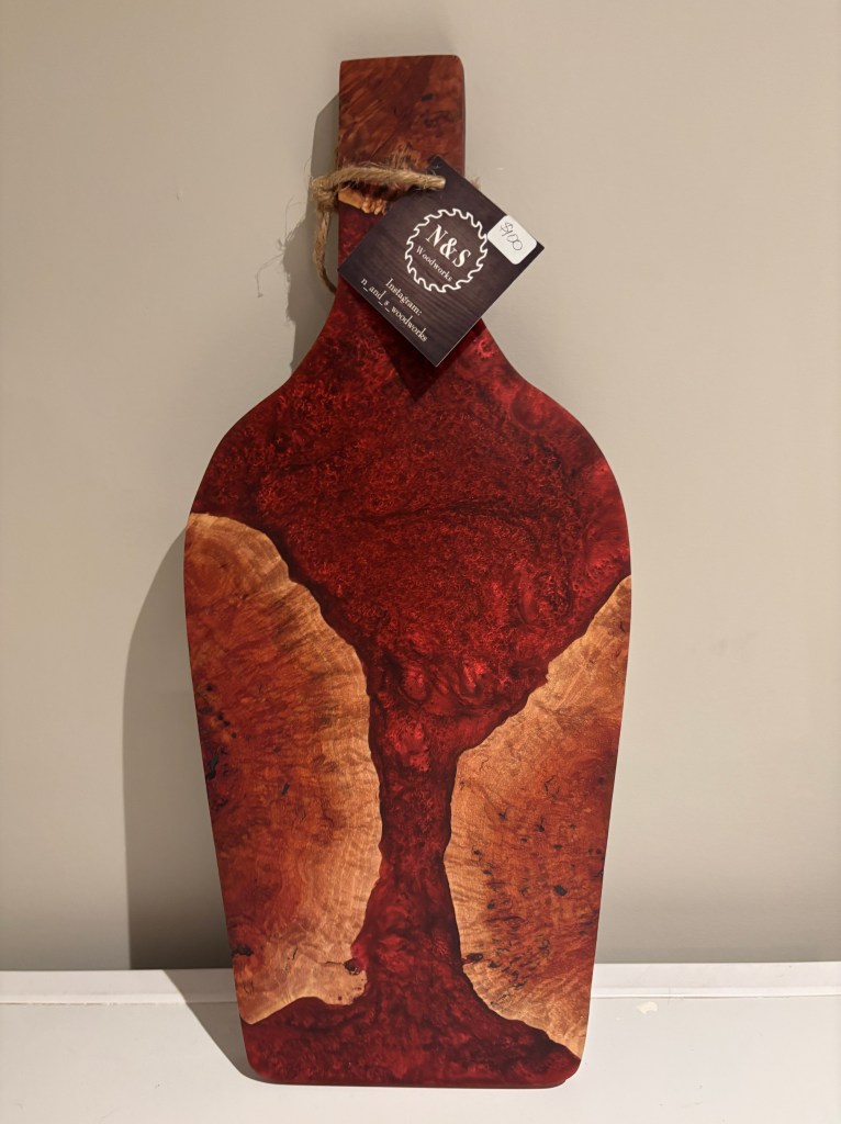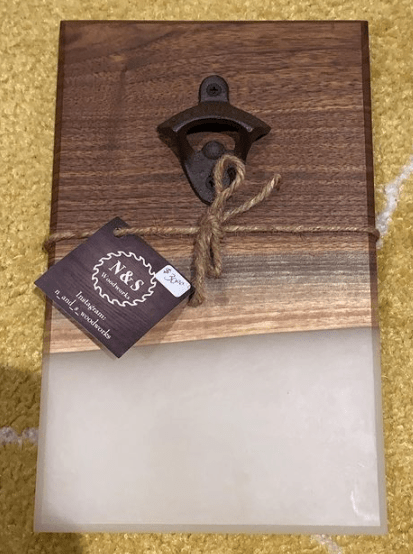 All of our charcuterie boards, trays, coasters and luxury boards are handmade with a variety of kiln dried locally sourced salvaged wood and with or without epoxy. The boards vary in width as the wood is natural and comes from different widths of Black Walnut, Maple, Cherry, or Olive Trees. Edges that are cut are beveled, sanded to a buttery smooth finish and coated in food grade wax and oil. The live edges are kept to show the natural curves and beauty of the wood.